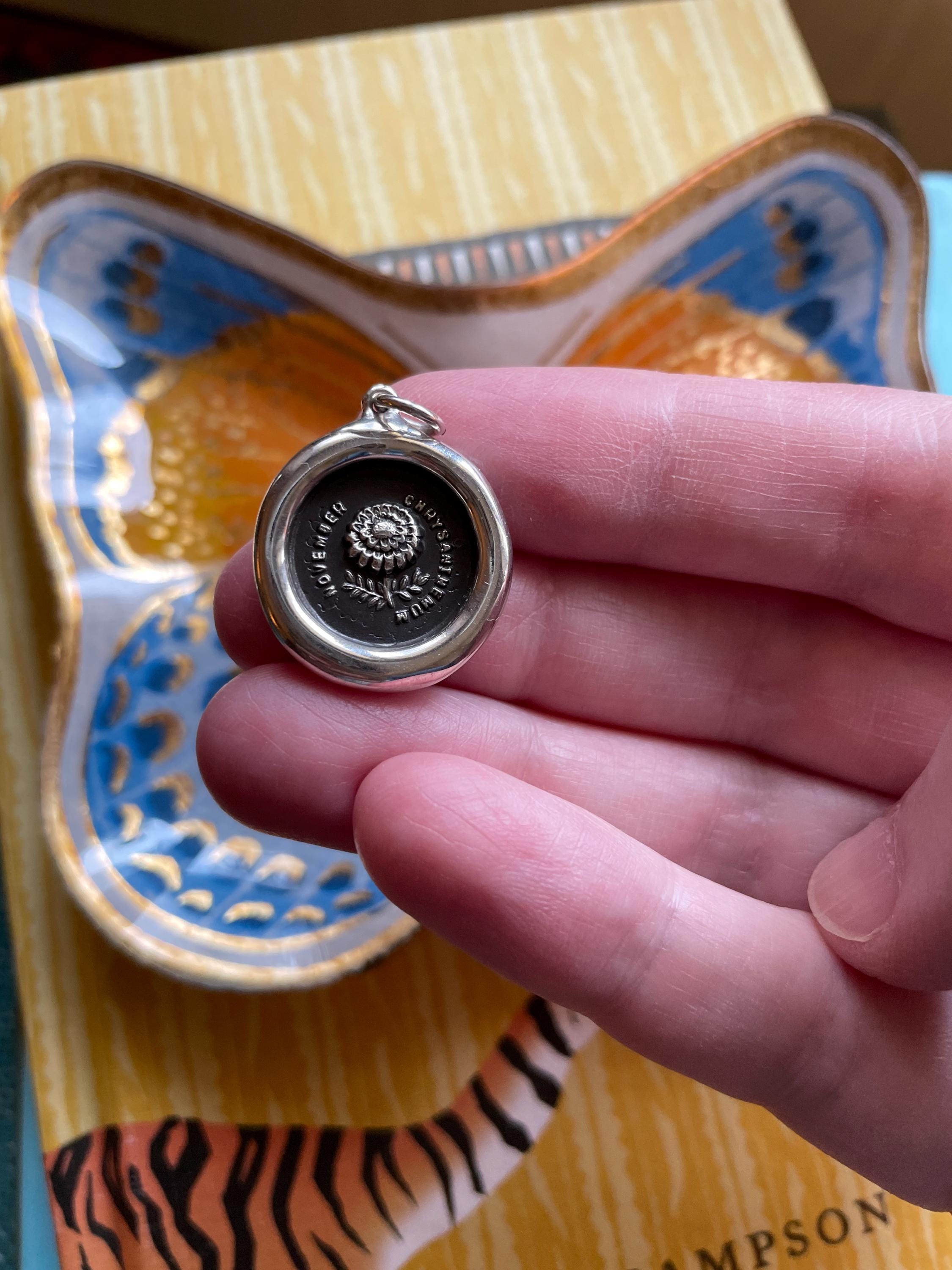 Sterling Silver Birth Month Flower Wax Seal Pendant with Patina